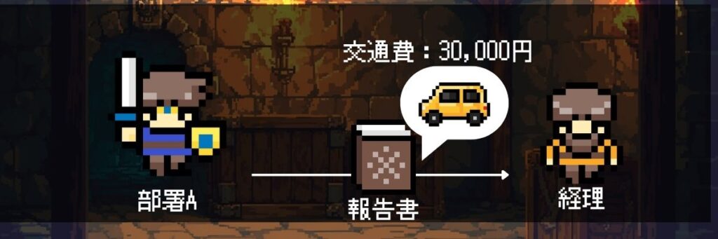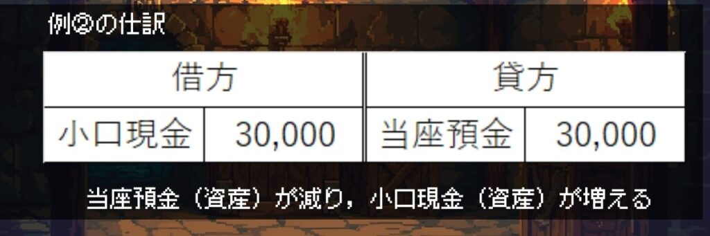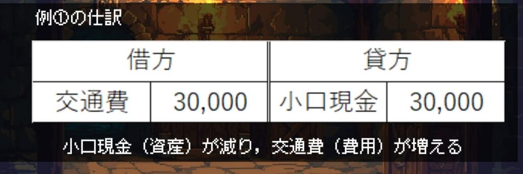 例①:小口現金について交通費30,000円の支払う報告があった。