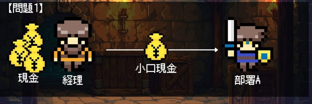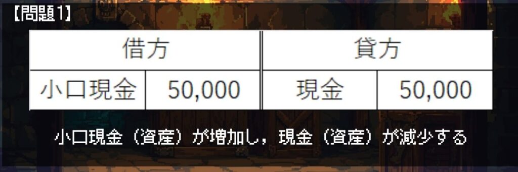 【問題1】4/1に小口現金として50,000円を現金から渡した。当社は「定額資金前渡法」を採用している。次の取引を仕訳しなさい。