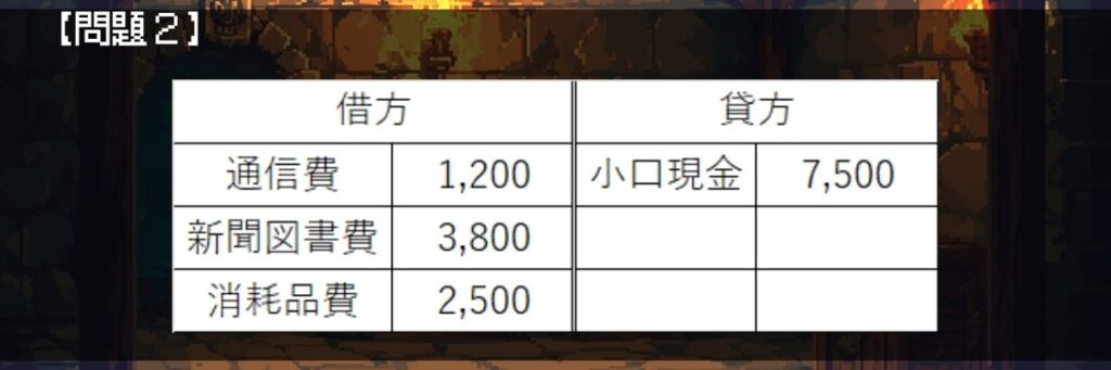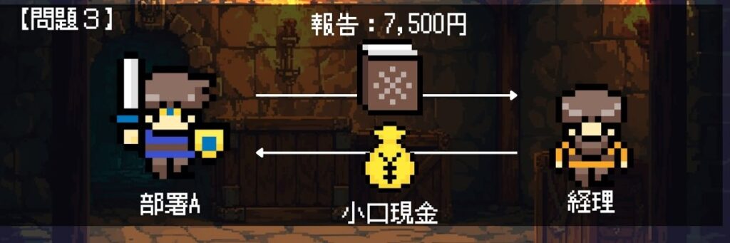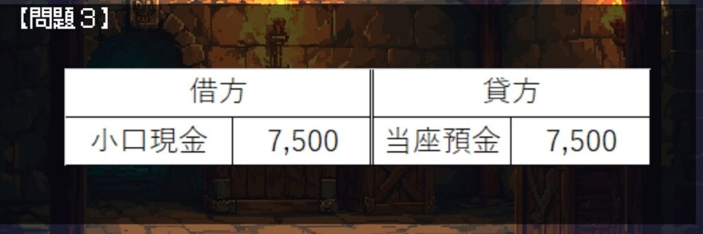 【問題3】4/30に小口現金での支払い7,500円だったと報告があったので,定額を補充した