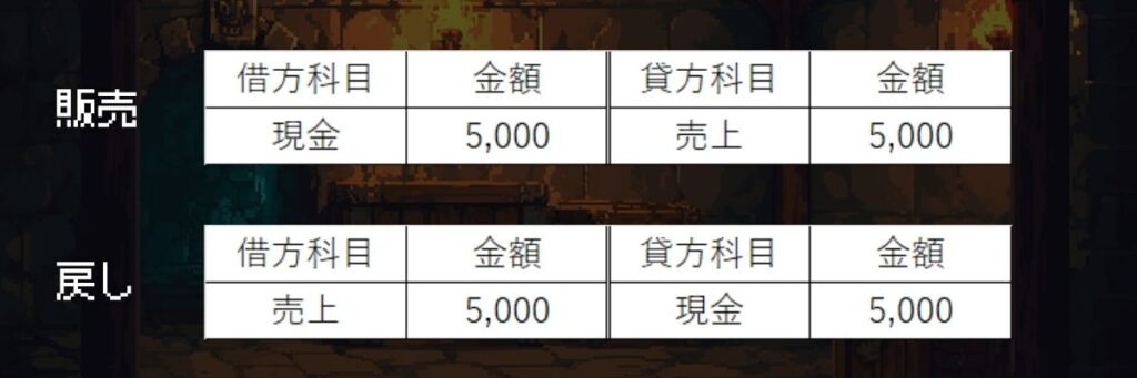 例題:勇者は商品5,000円を取引先へ販売した。代金は現金で受け取った。しかし,商品の品違いがあったため,全品返品された。この取引を仕訳せよ。