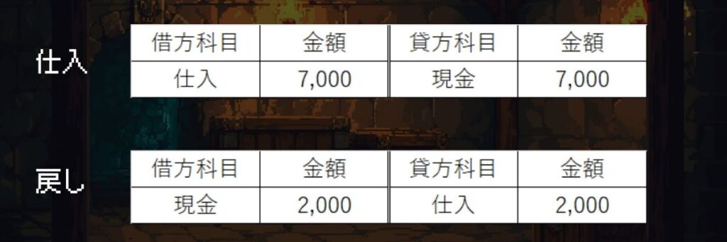 例題:勇者は取引先から商品7,000円を現金で購入した。しかし,仕入れた商品の一部が品違いだったため,2,000円分を返金した。この取引を仕訳せよ。